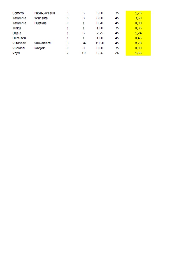 I genomsnitt hittades de flesta kläckbara bladlössvinterägg i proverna från Pylkönmäki (14), Viitasaari (9) och Lappeenranta (8), där antalet låg nära gränsen för möjlig skaderisk. Inga bladlössvinterägg hittades i sju prover.
