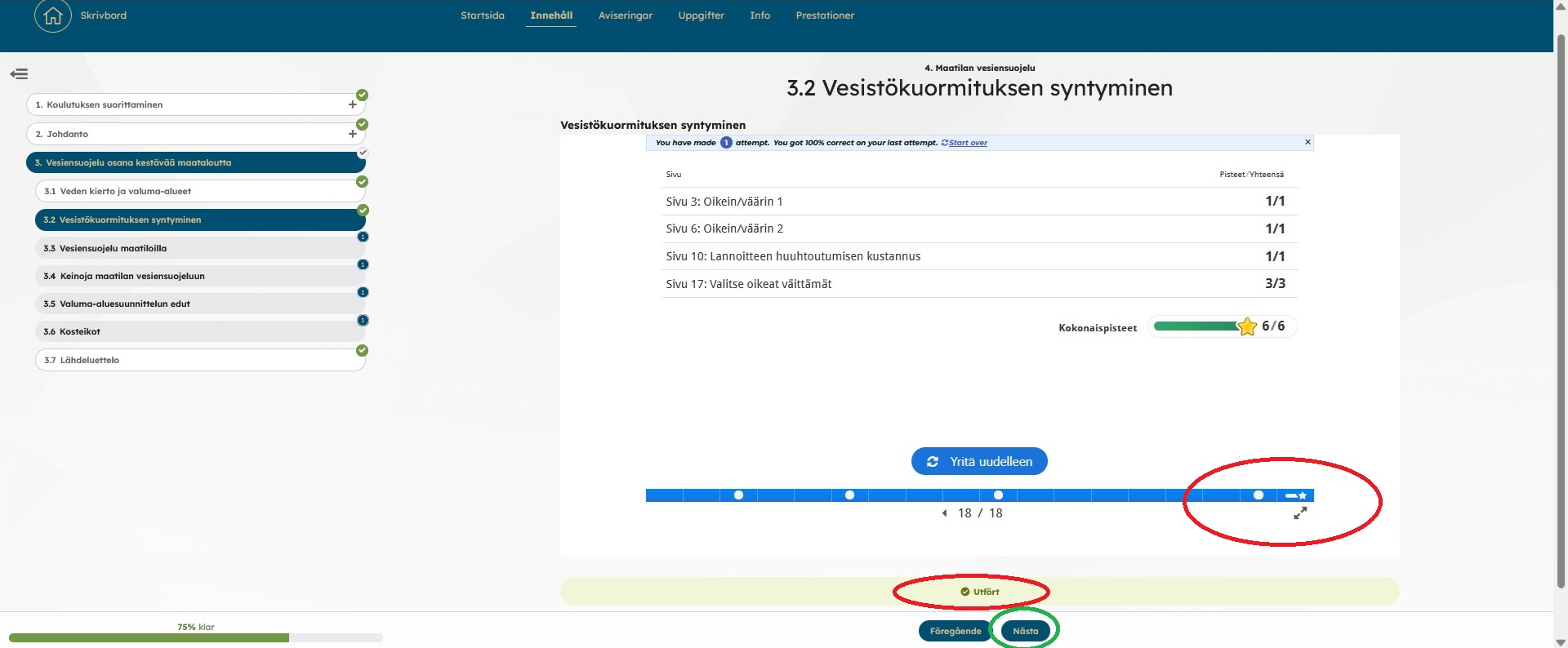 Här på bilden nere i vänstra hörnet ser man att ännu bara 69% av kursen är genomförd. På bilden ser man också nere i högra hörnet att två skeden av denna kursdel ännu är gråa, alltså inte genomförda. Där som det finns ”bollar” hittas uppgifterna, och de andra är bara textsidor. Man ska inte gå framåt genom att klicka på ”Nästa”, med den hoppar man mellan olika kursdelar, utan man ska istället klicka sig framåt på den gråa/blåa balken.