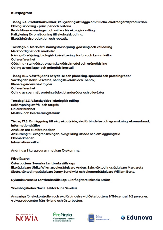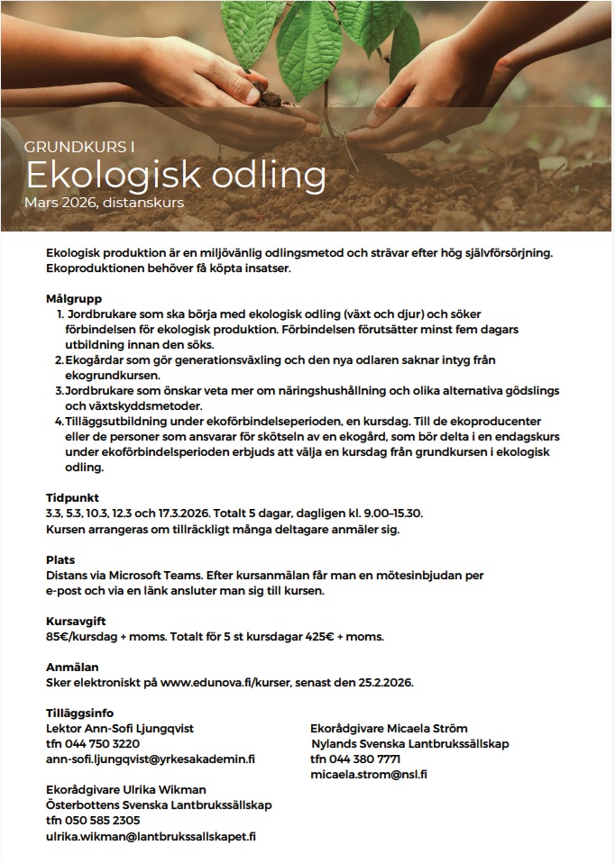 Kursen går på svenska i mars, distans via Teams och är som tidigare år ett samarbete mellan Edunova, Nylands Svenska Lantbrukssällskap och Österbottens Svenska Lantbrukssällskap.