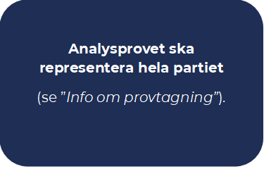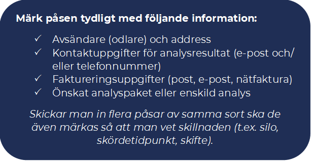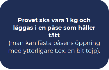 Postpaket: packa provpåsen/ -påsarna tätt i en lämplig låda. Fyll upp eventuellt tomrum i lådan med t.ex. tidningspapper eller förpackningsplast (”bubbelplast”) så att påsarna inte skakas om under transport. Förslut lådan noga.